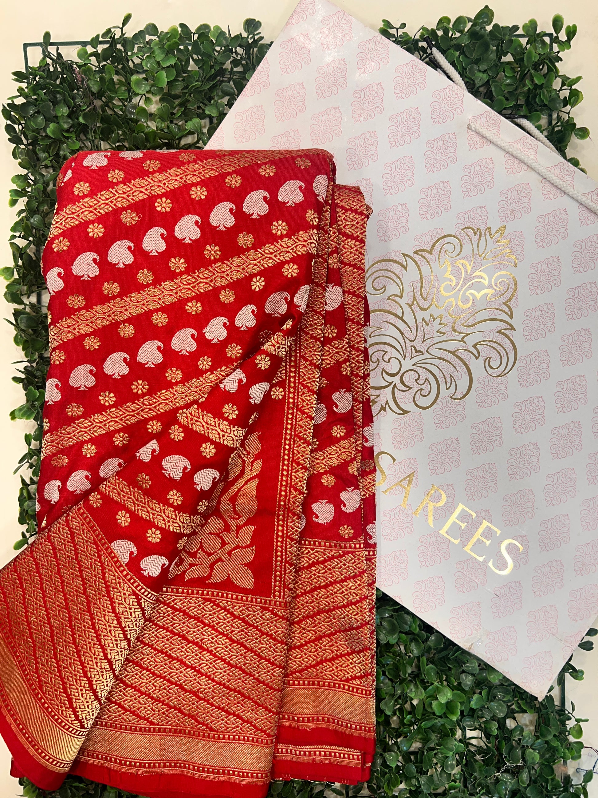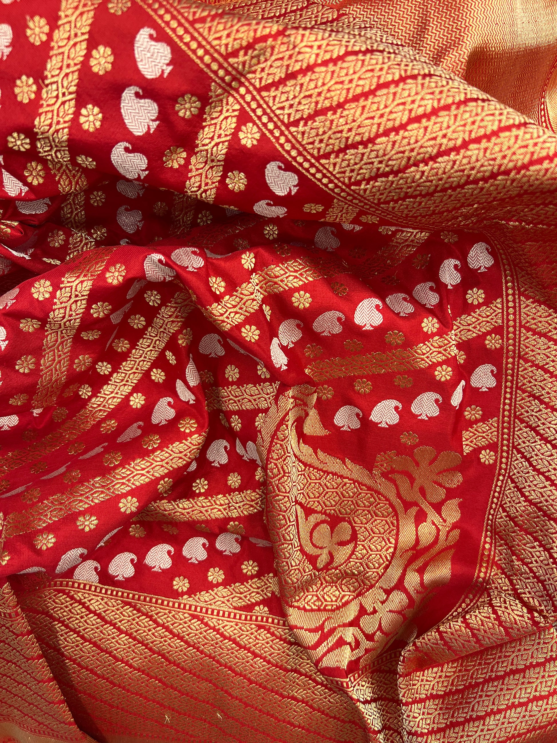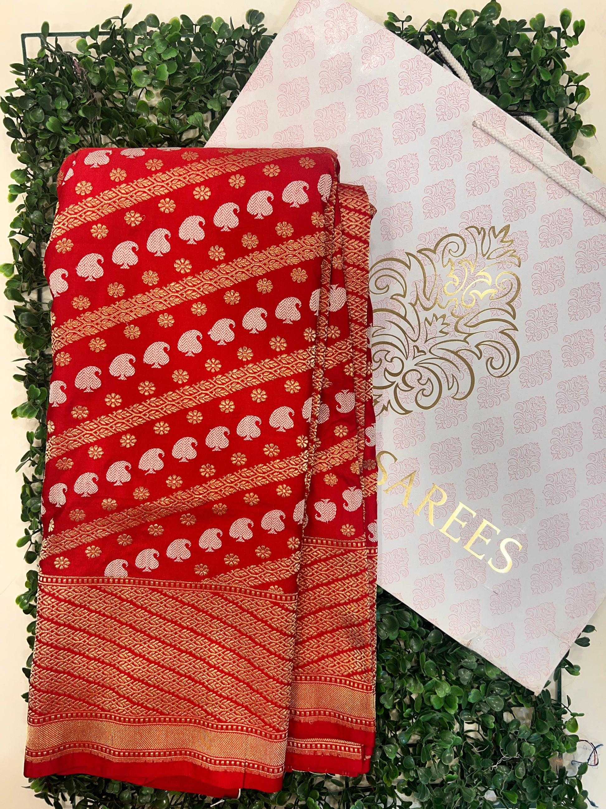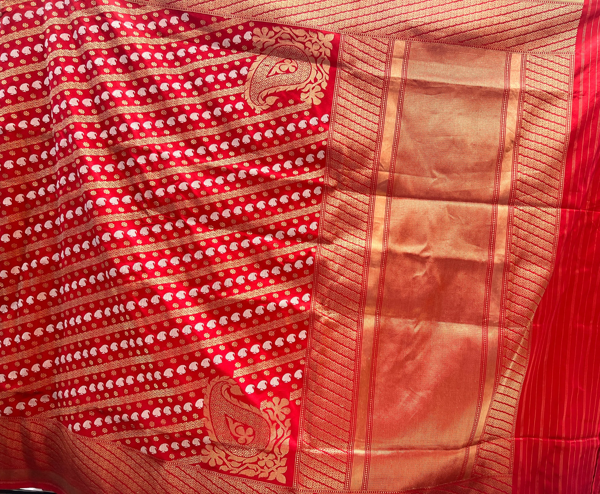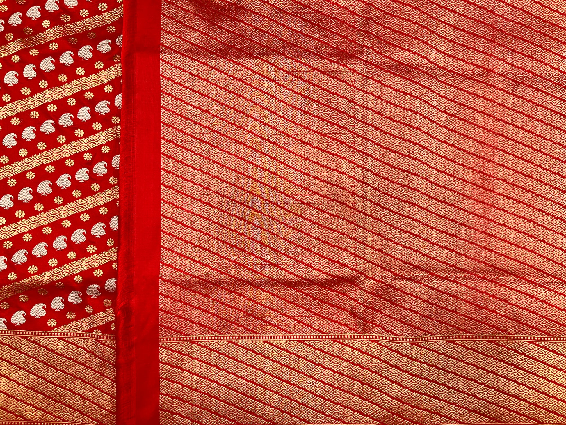 Banarasi Lehriya handloom saree is crafted in a graceful play of flowing wave patterns. The classic lehriya stripes are beautifully highlighted with gold and silver zari, lending the saree a luminous sheen and festive charm. Handwoven on traditional looms, the rich Banarasi silk drapes effortlessly, reflecting timeless elegance and artisanal finesse.