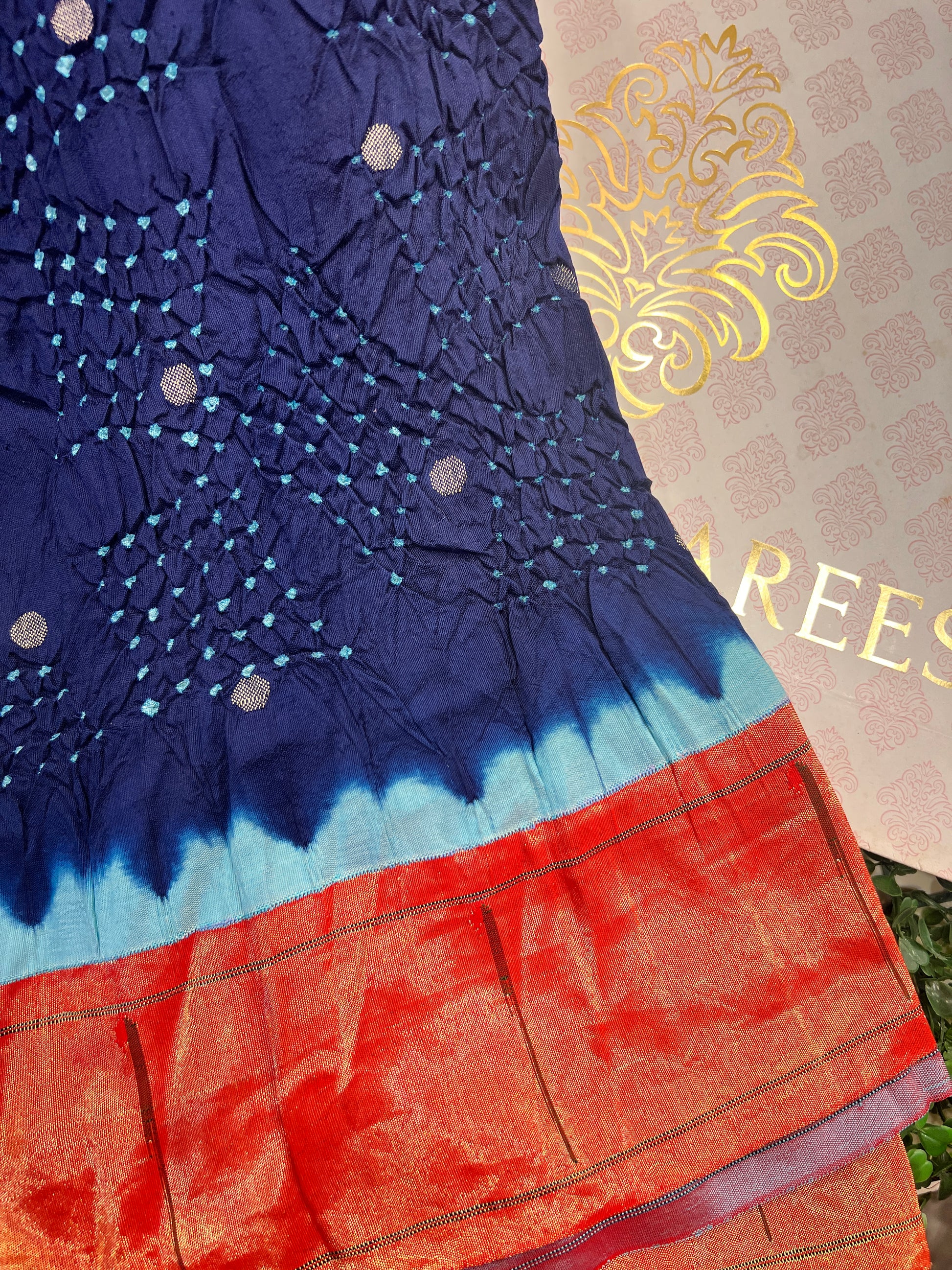 This stunning Bandhani saree paired with a rich Paithani-style border. The body features classic Bandhani tie-dye work with delicate dotted patterns, reflecting the timeless craftsmanship of Gujarat and Rajasthan.