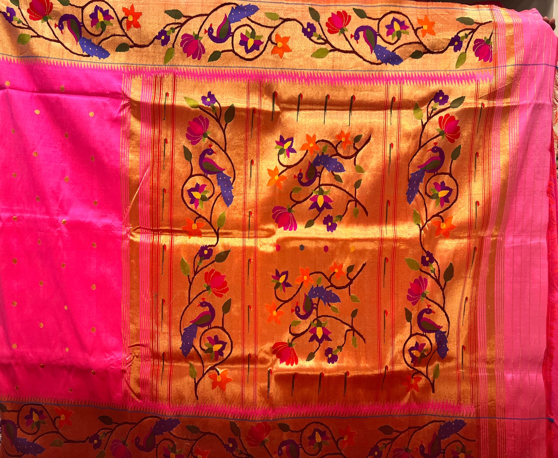 The vibrant pink body, adorned with delicate zari buttas, exudes festive charm, while the rich skirt border is beautifully woven with classic Paithani motifs — peacocks, parrots, and floral vines — in striking hues of purple, green, and orange on a shimmering gold zari base.
