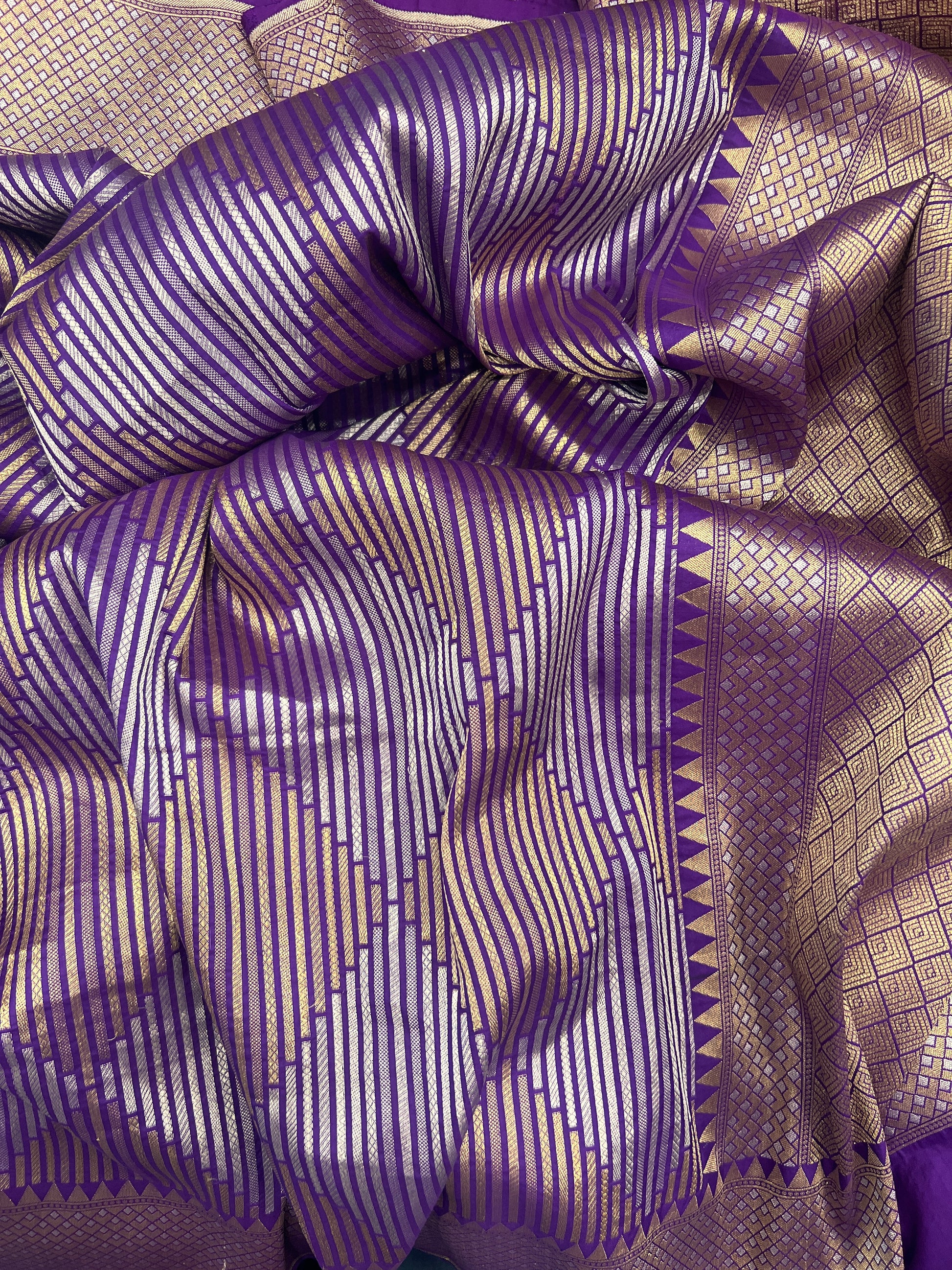 Purple Geometrical Banarasi saree showcasing an exquisite play of gold and silver zari woven into elegant geometric patterns across the body. The rich purple base is beautifully balanced with finely detailed zari work, creating a luminous texture and timeless appeal. Finished with a classic Banarasi border and pallu, this saree exudes grandeur and sophistication.