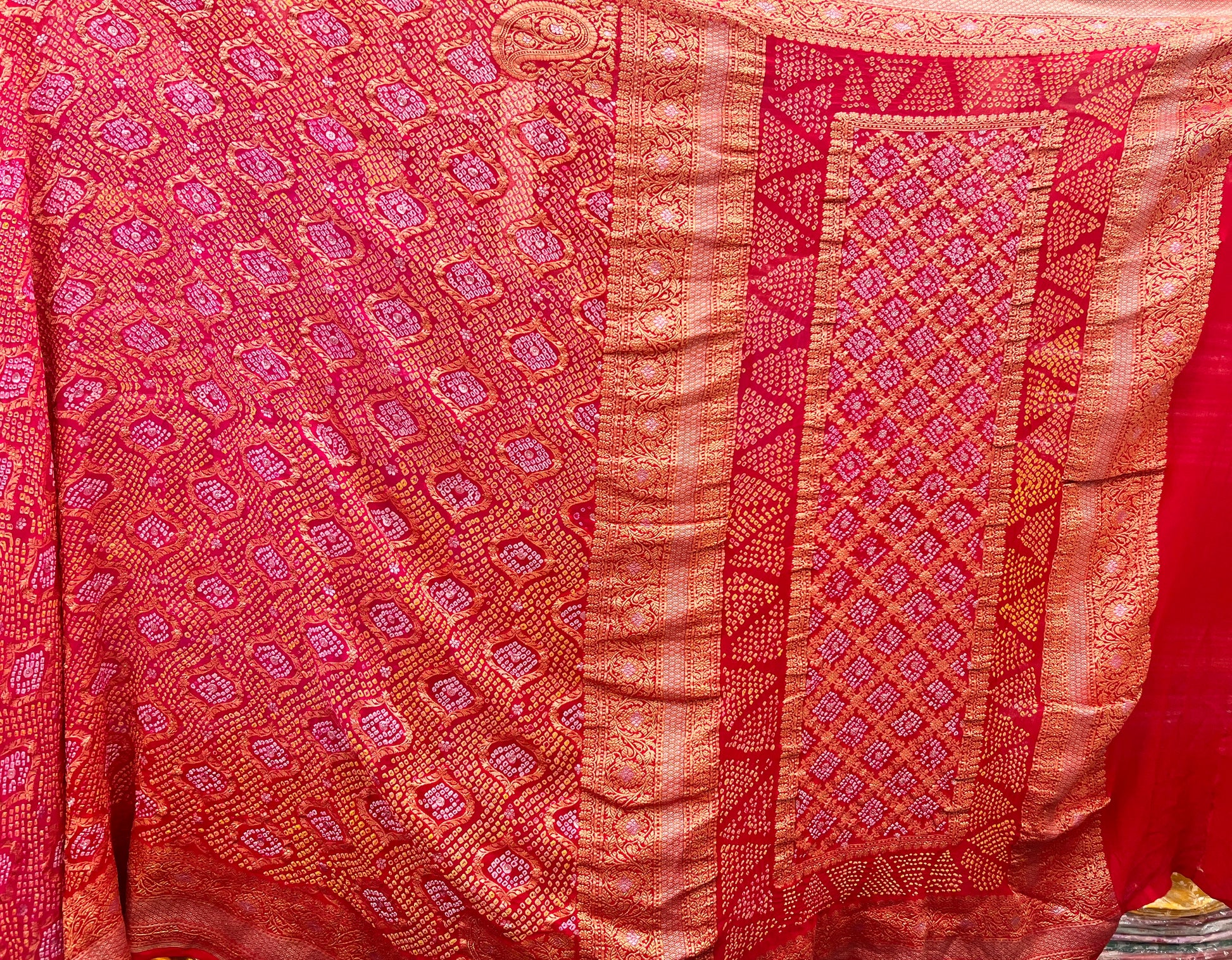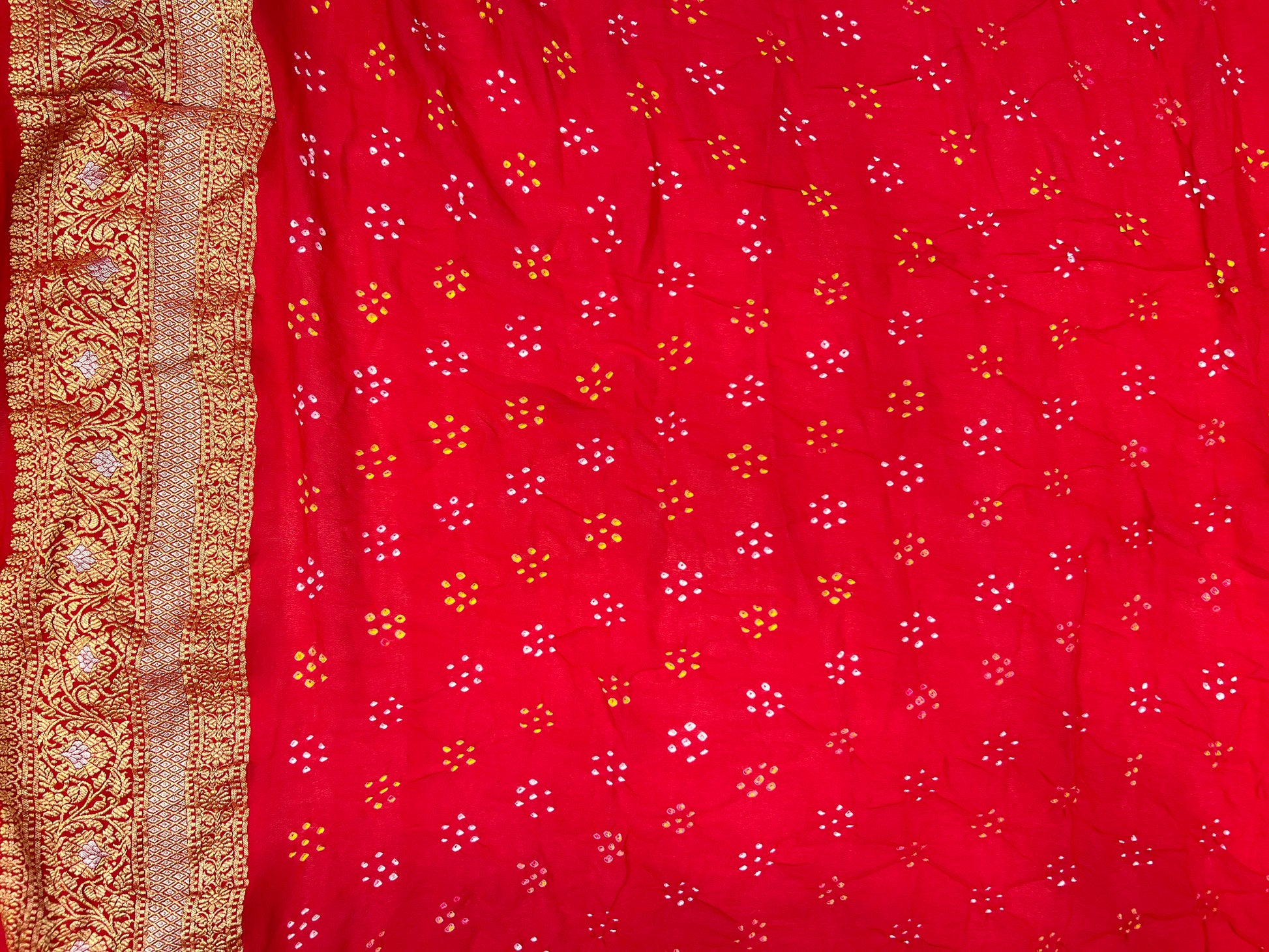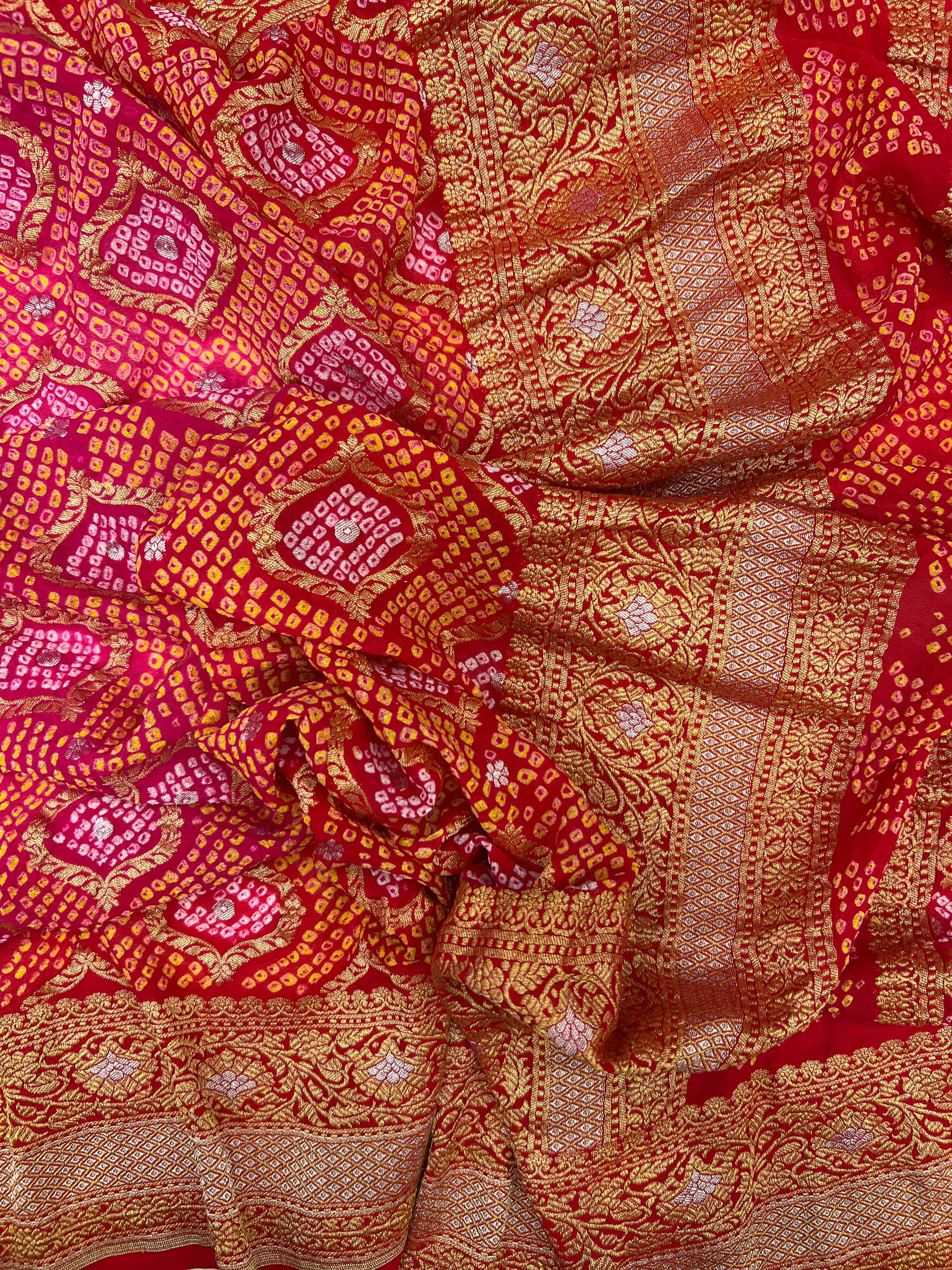 Rai Bandhej tie-dye work, this saree reflects the rich heritage of traditional Bandhani craftsmanship.