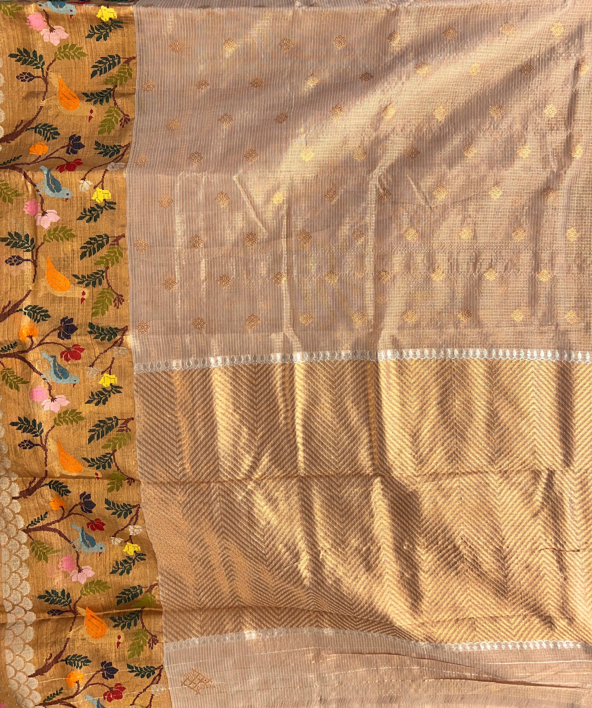 This Real Zari Kota saree, celebrated for its airy, lightweight weave and sparkling zari sheen. The highlight of this masterpiece is its bird-themed skirt border, featuring intricately woven parrots and floral vines that add a vibrant, heritage-inspired charm.