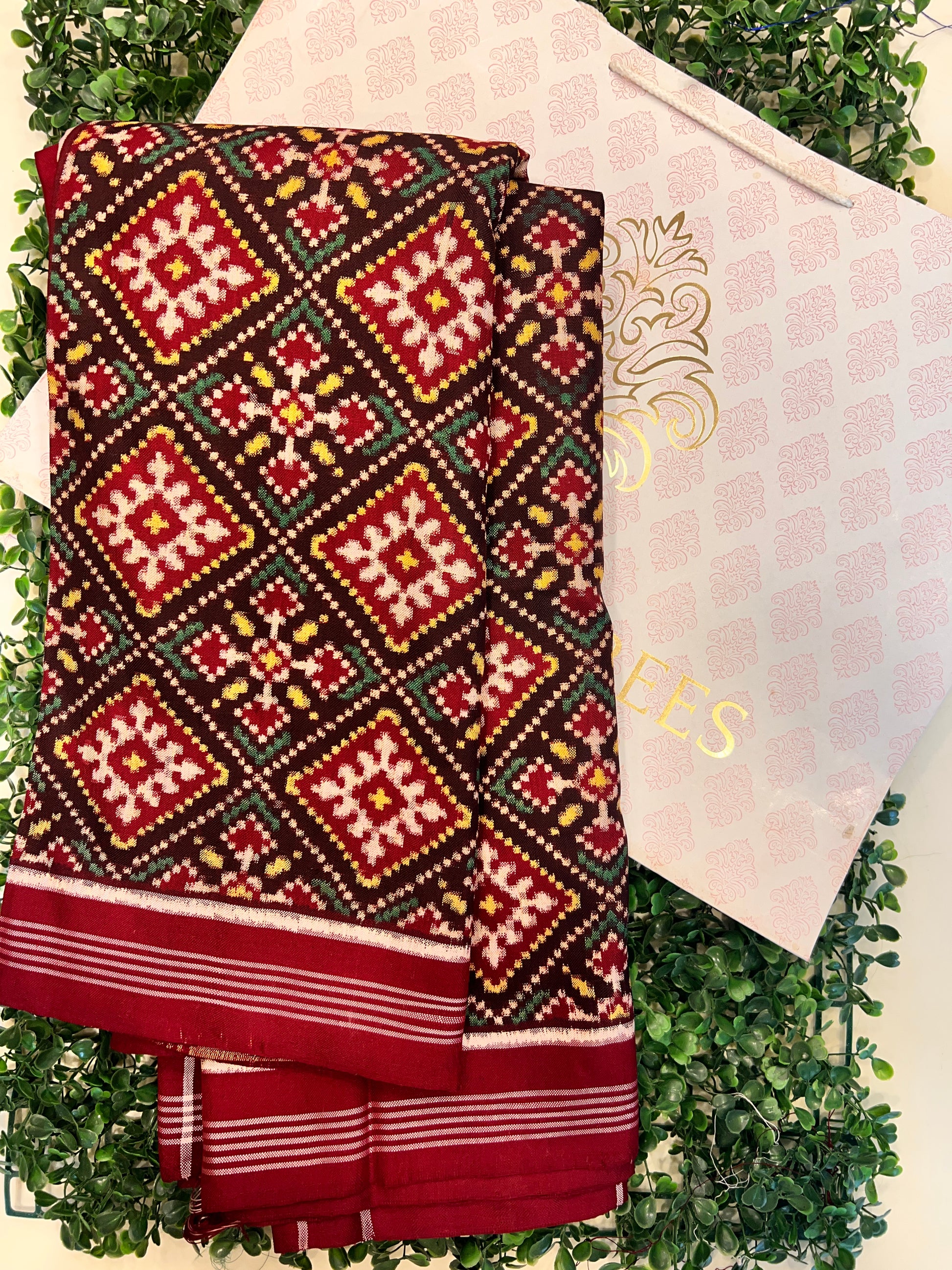 This stunning Red Patan Patola is a true celebration of Gujarat’s iconic double ikat tradition. The rich red base is beautifully adorned with classic Patola motifs—intricate geometries, symbolic elements, and heritage-inspired patterns—each crafted with precise tie-dyeing of both warp and weft threads before weaving.