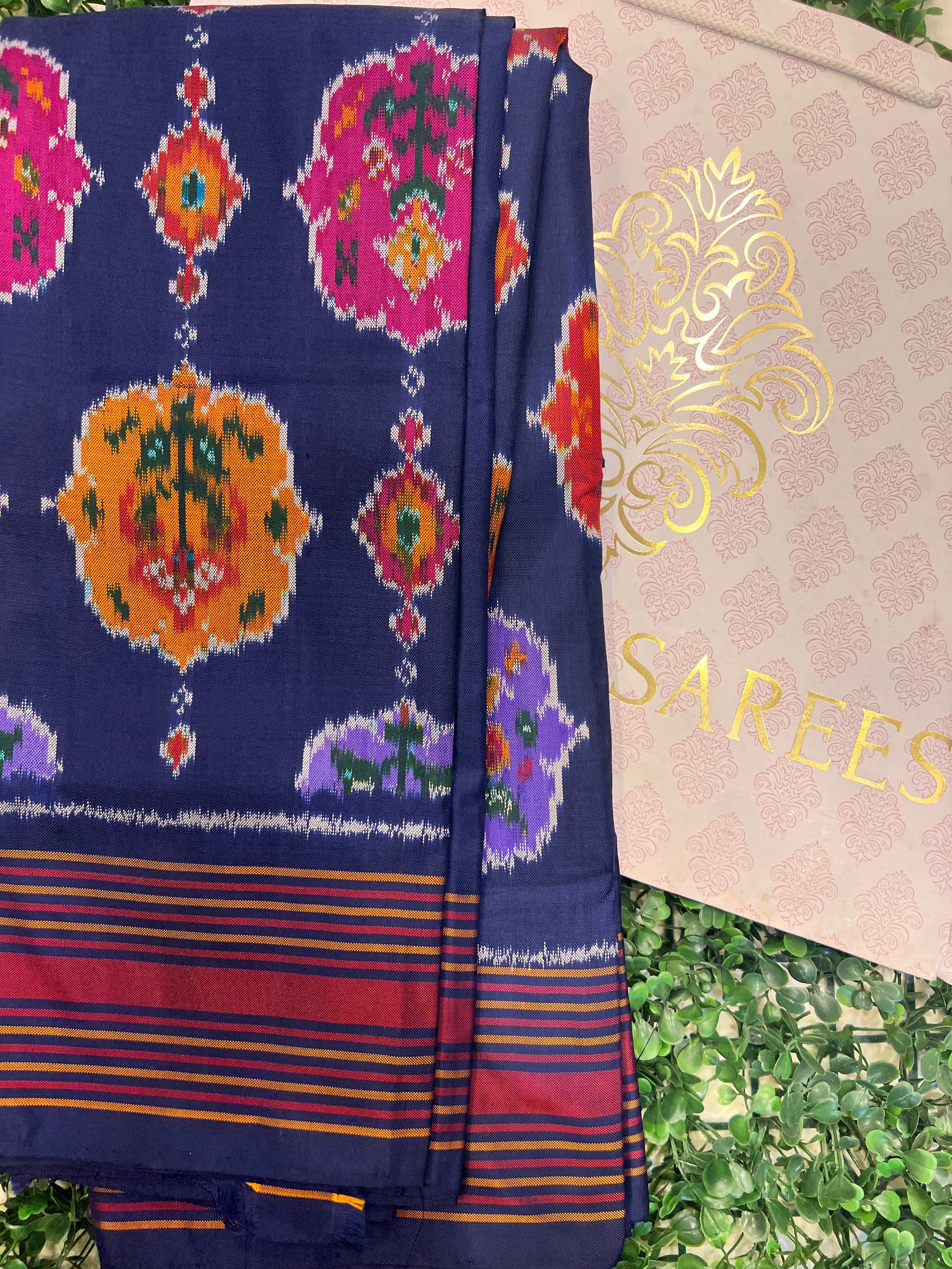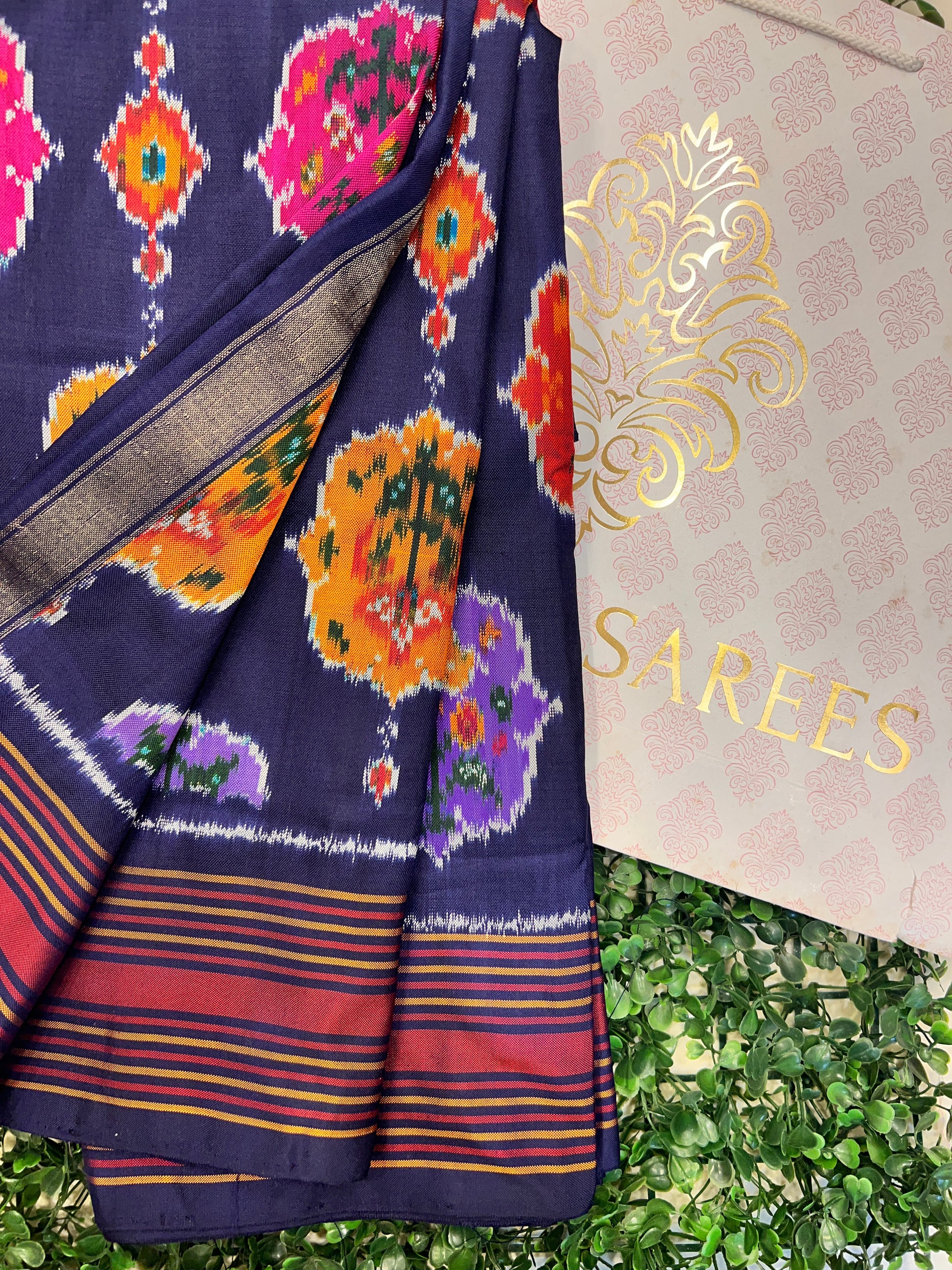 Crafted with beautiful ikkat weaving, this saree features colorful floral motifs on a rich navy blue base, creating a stunning and eye-catching look.
