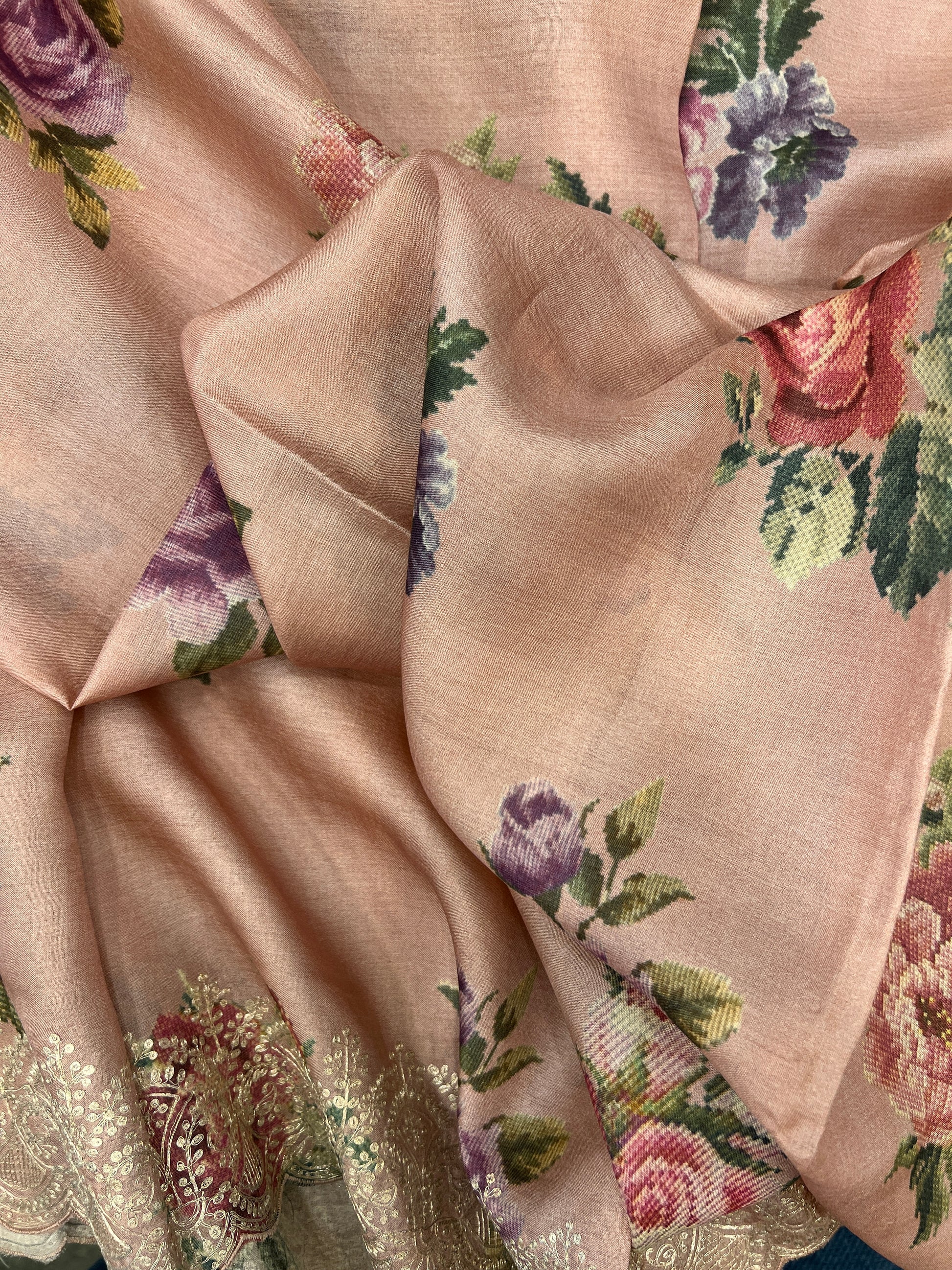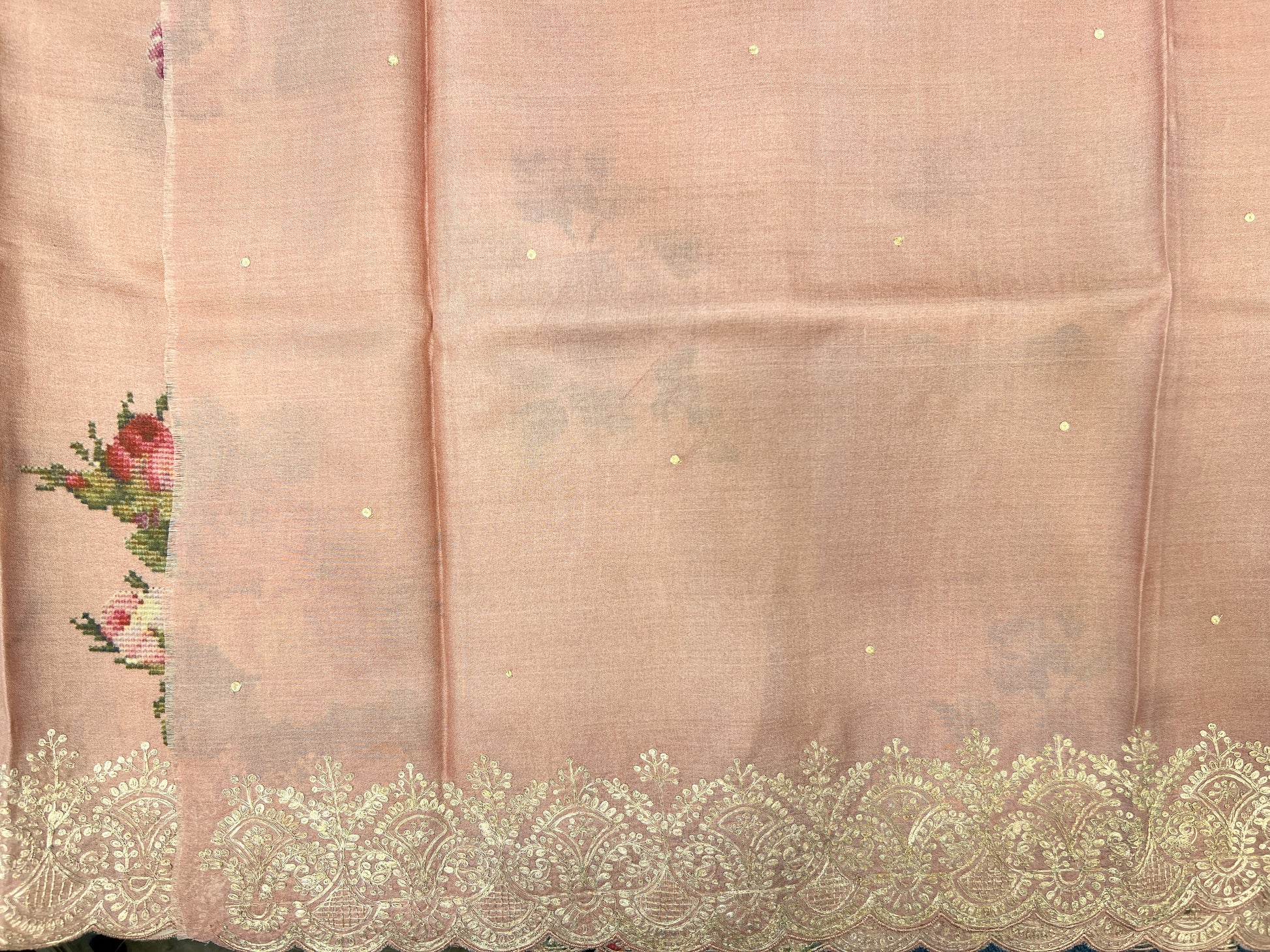 This Tussar saree features exquisite Zari Taar embroidery that beautifully complements its subtle floral motifs. The soft silk texture drapes effortlessly, while the delicate sheen of zari adds a touch of regal charm.