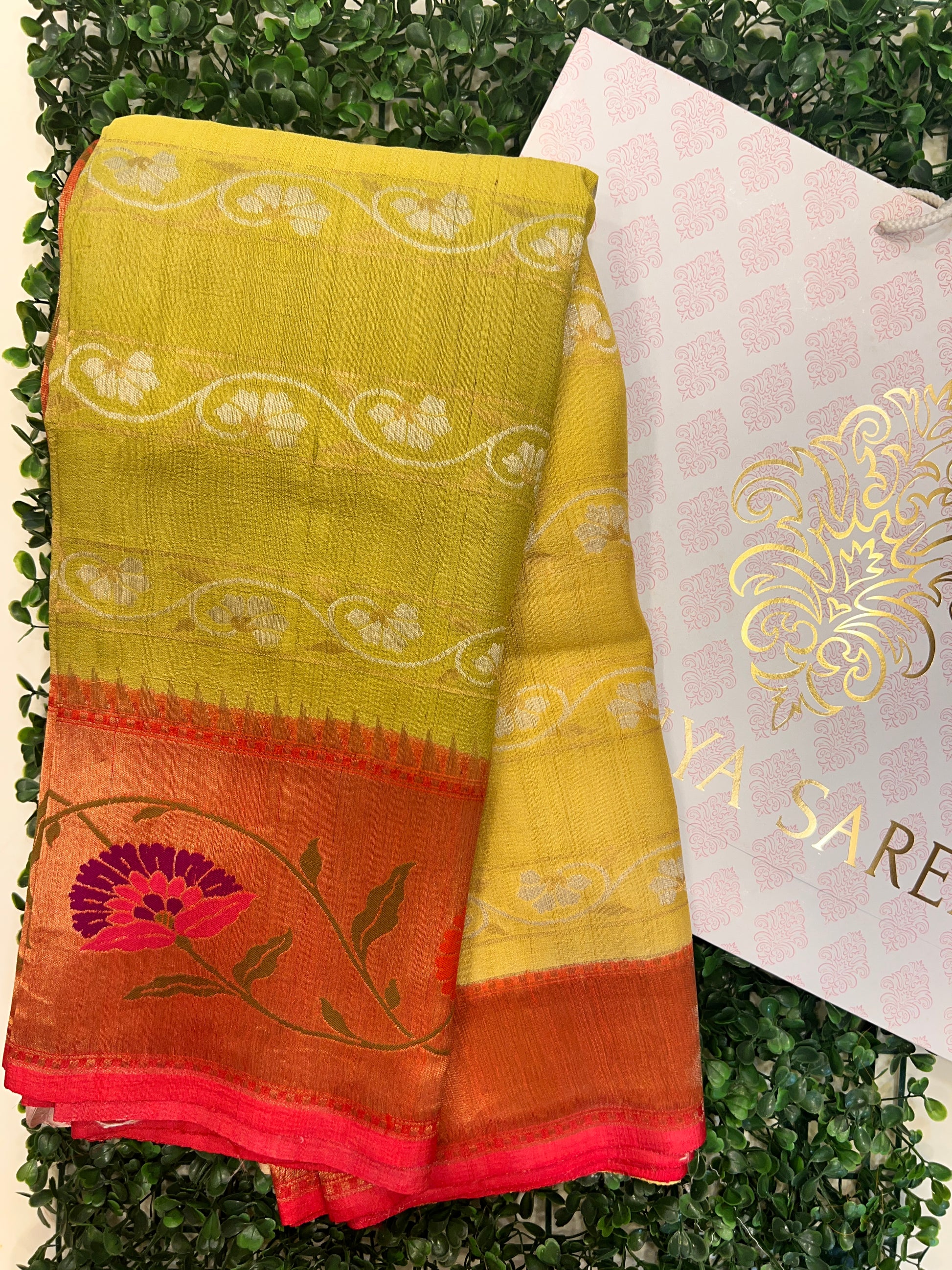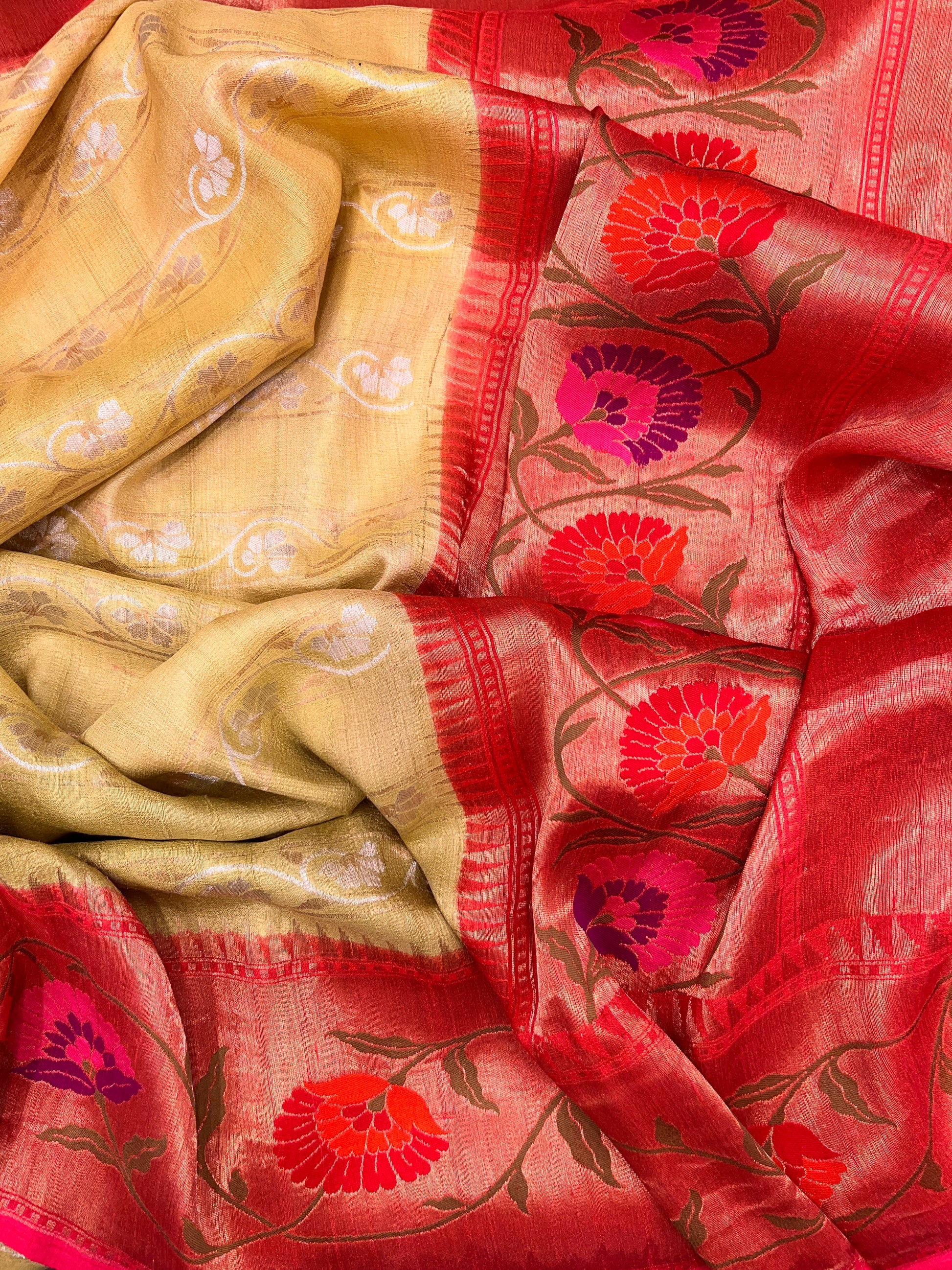Tussar Georgette saree features a graceful tie and dye body in refreshing hues, beautifully complemented by a vibrant Paithani border. The delicate texture of Tussar Georgette drapes effortlessly, while the intricate floral motifs on the border add a touch of regal charm.