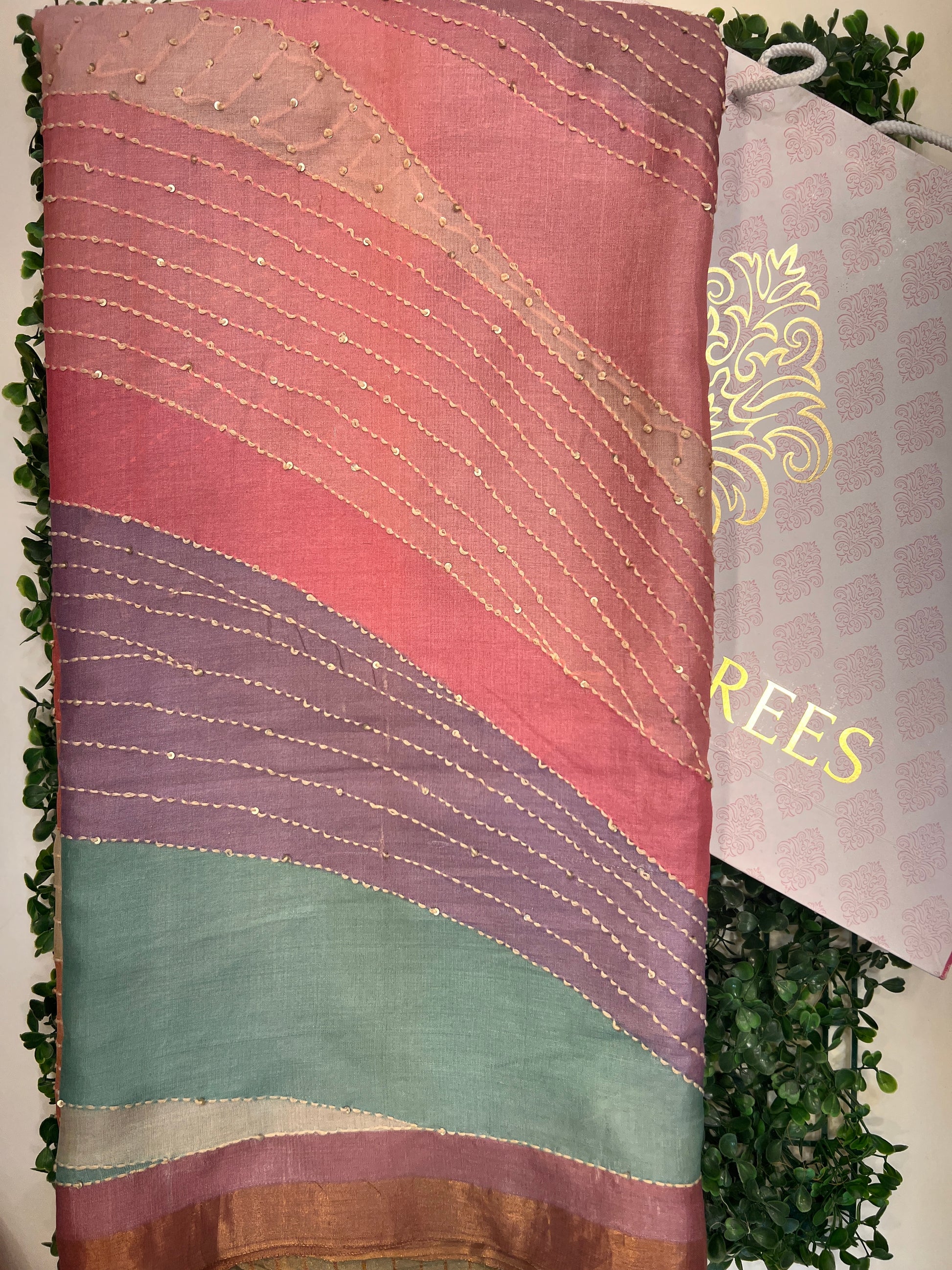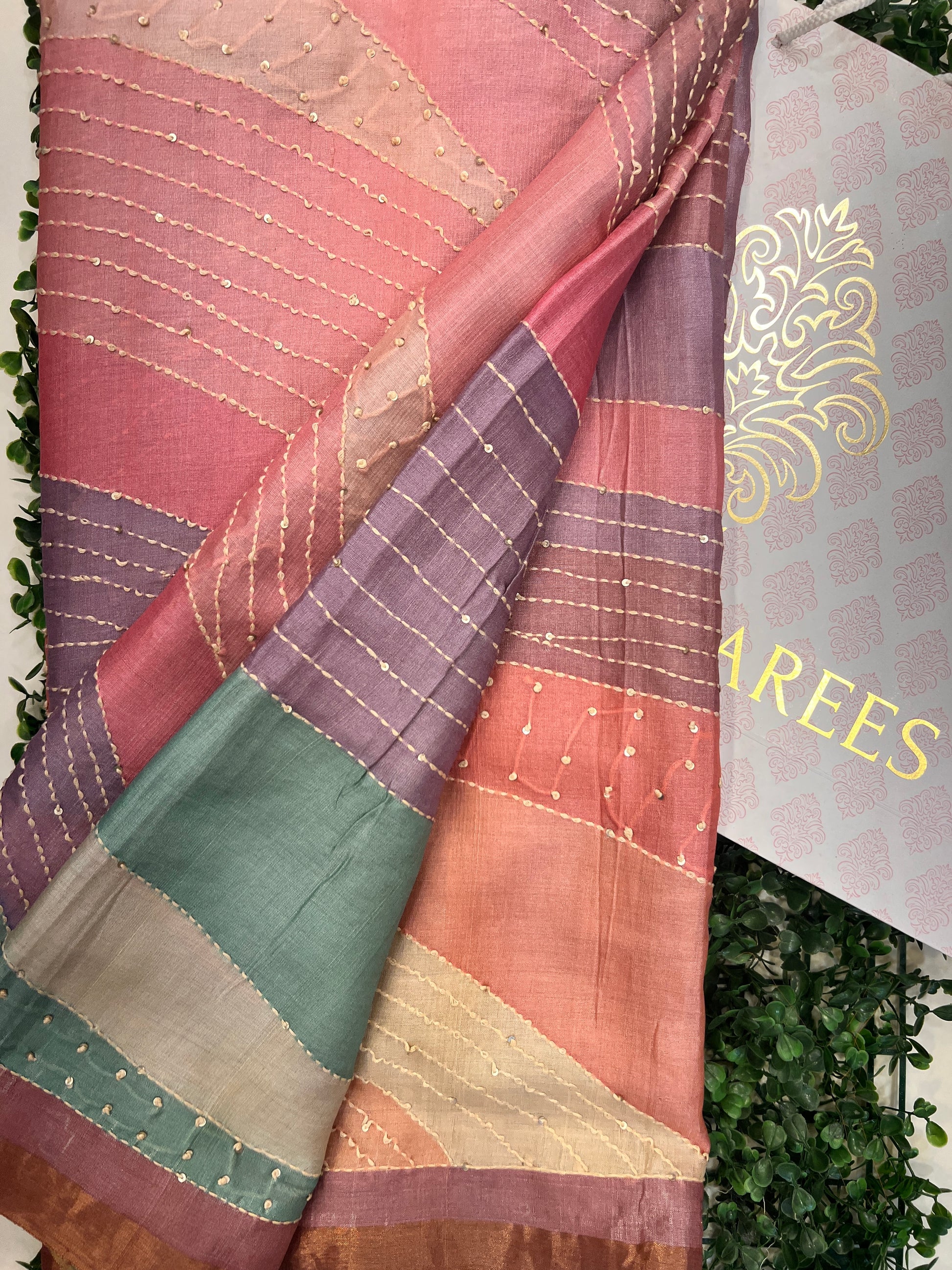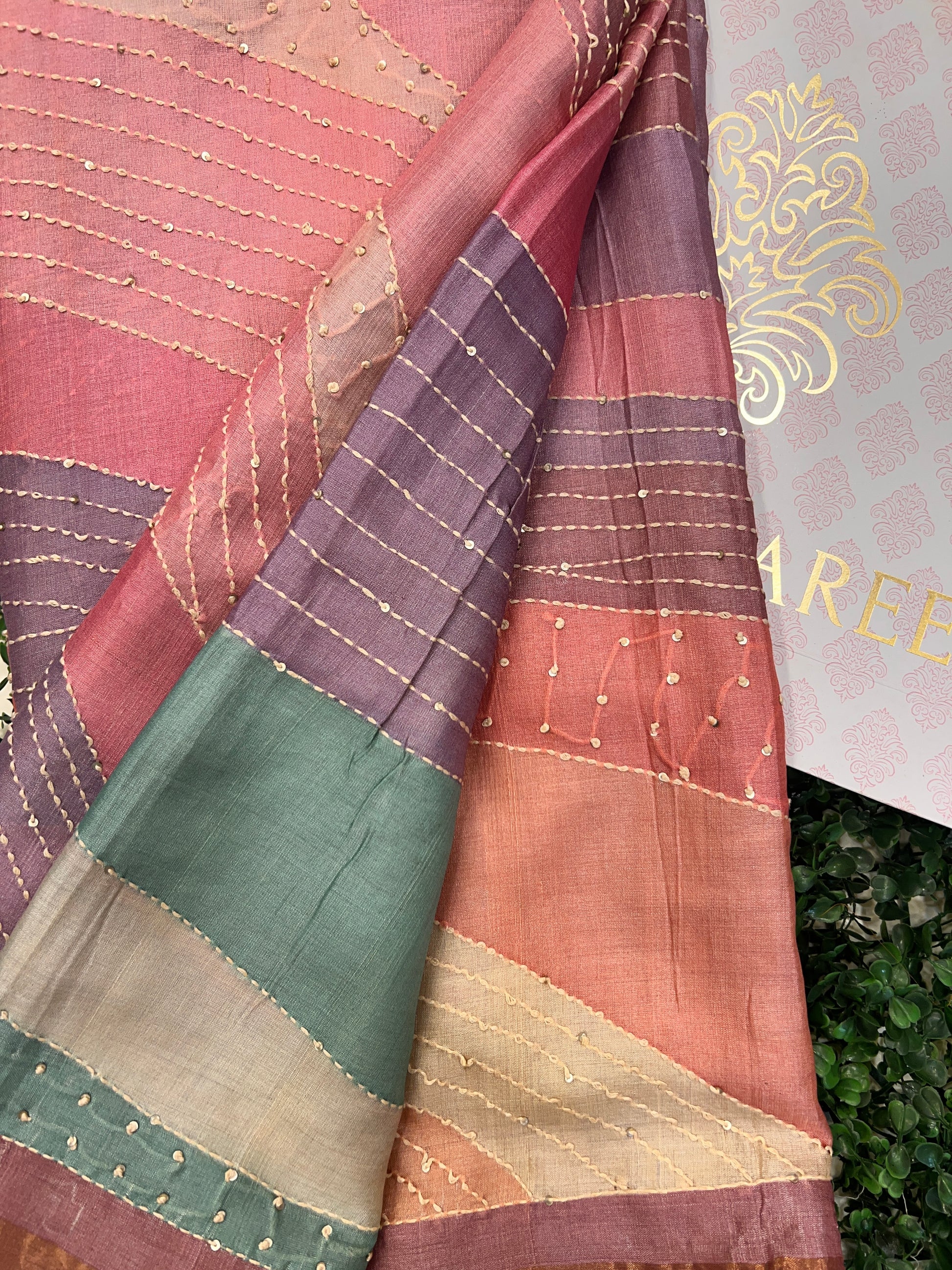 Tussar Rangkat saree showcases beautifully handwoven panels in soft earthy tones. The textured Tussar silk drapes gracefully, enhanced with delicate kantha-style threadwork and subtle gold embellishments.